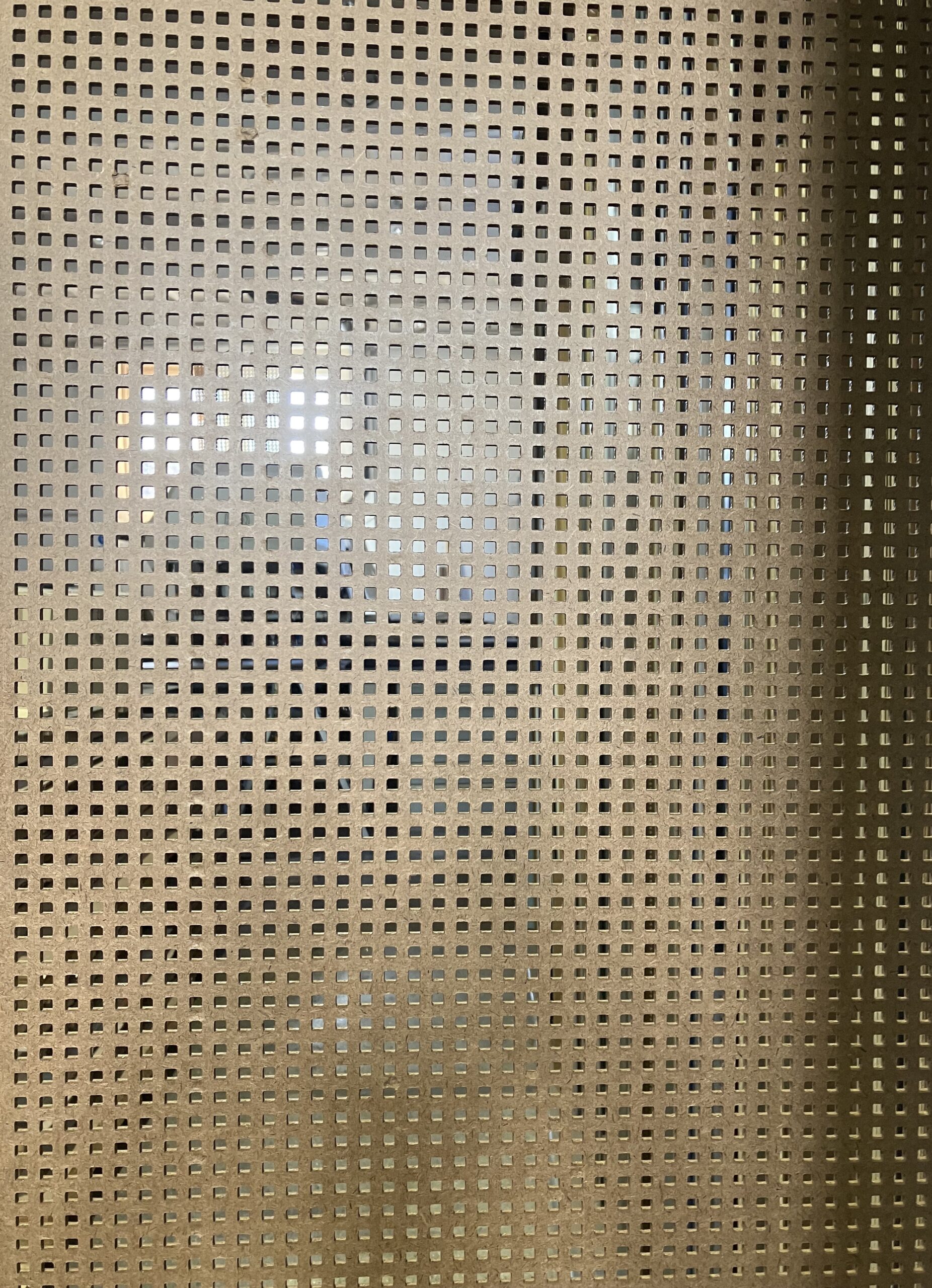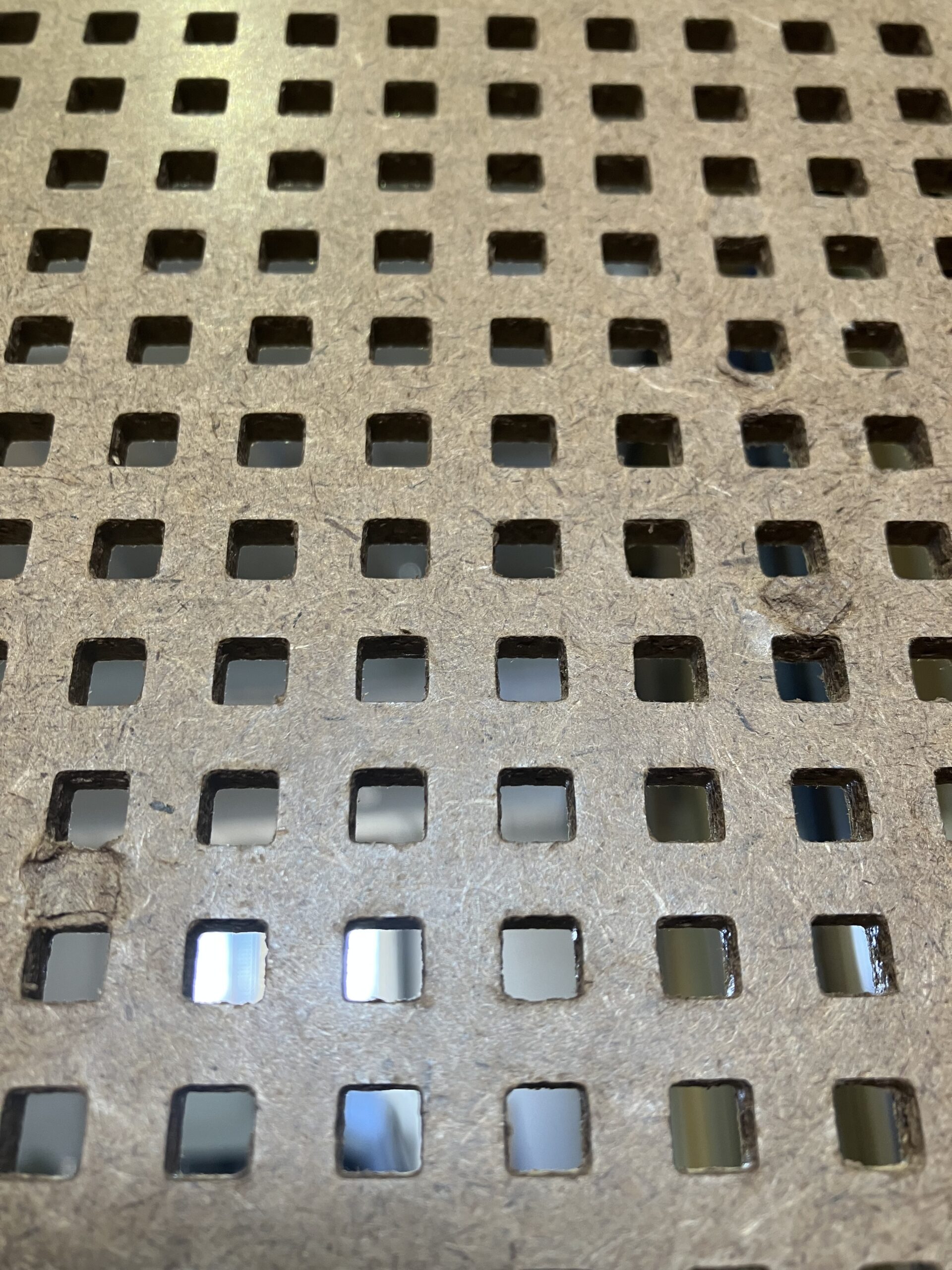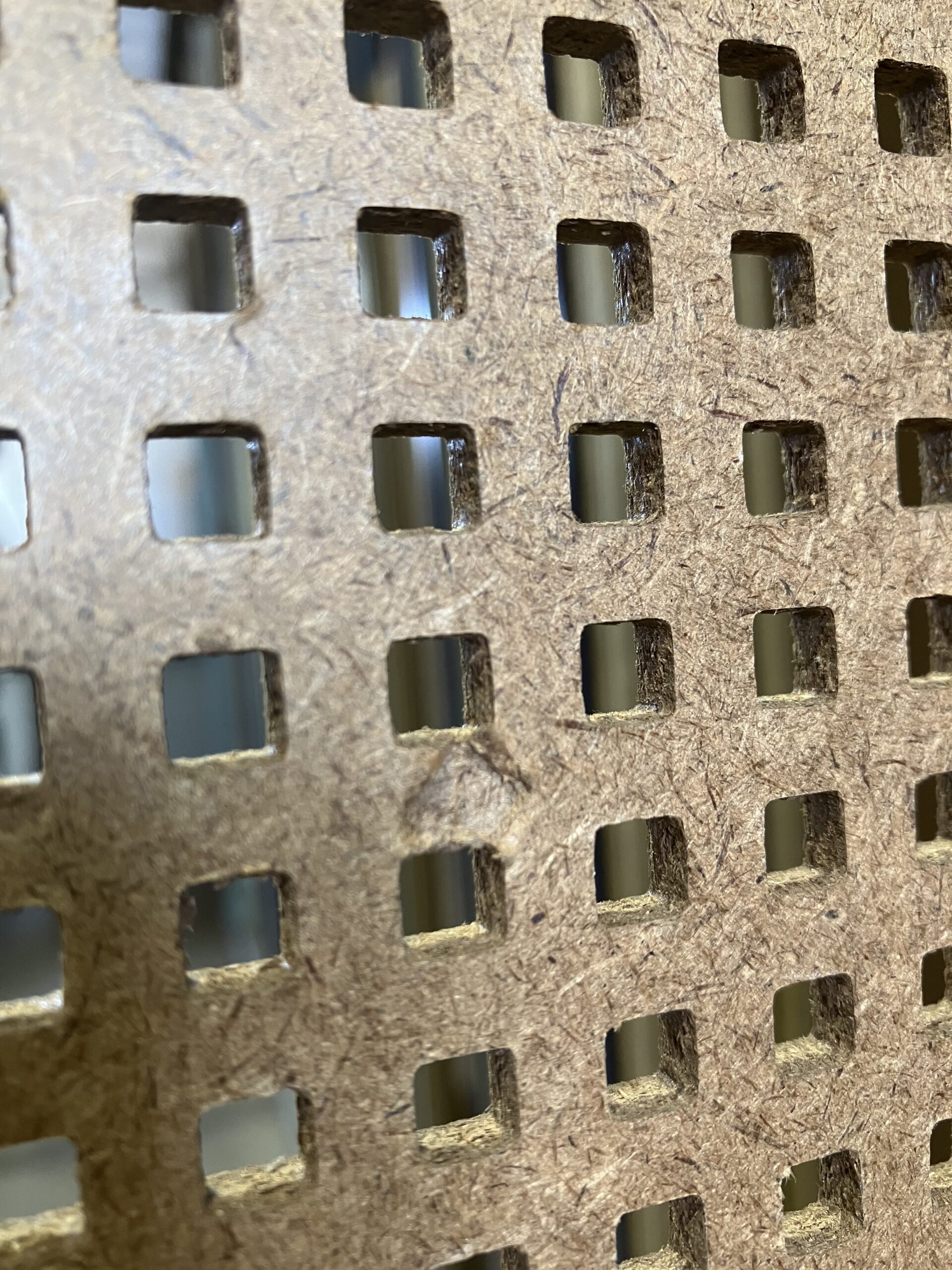 Nyers, perforált keményfarost lemez (HDF), színe sötét barna, frontoldala sima, hátoldala érdes. Alapozást, festést igényel.