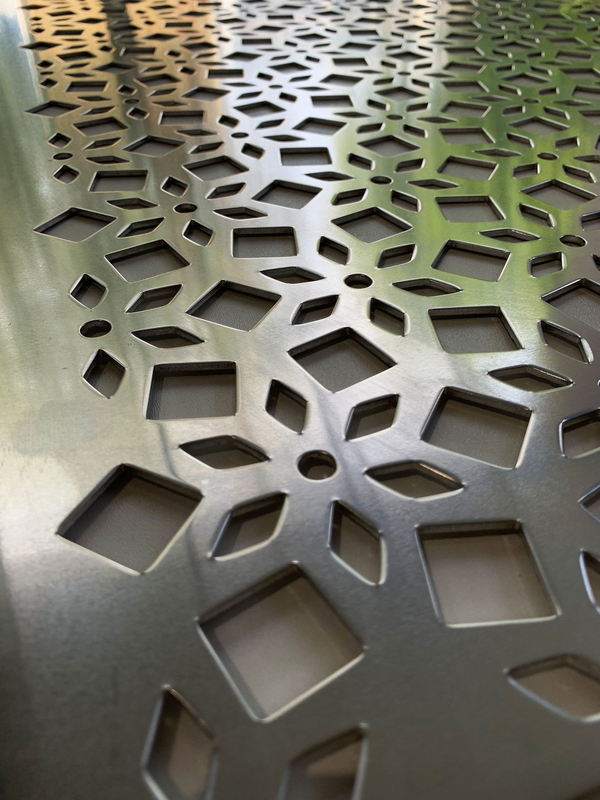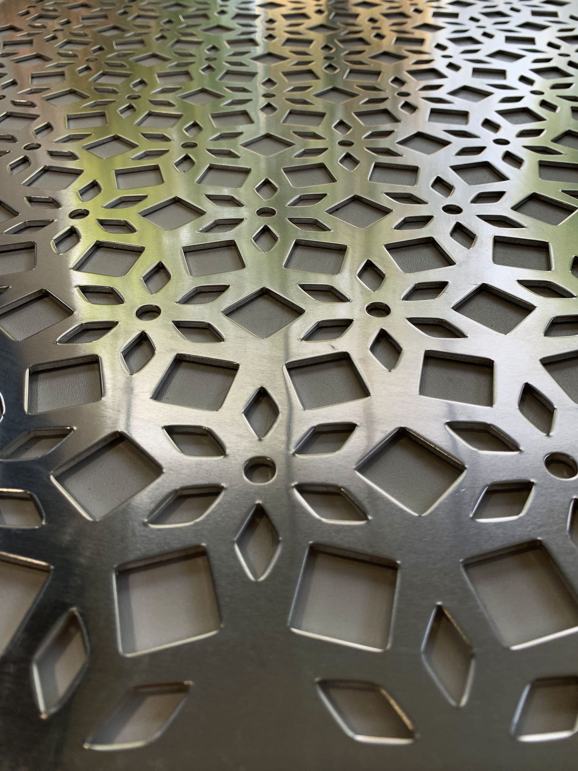 Néhány mintánkkal megrendelésre gyártunk 2 mm vastagságú, felületkezelés nélküli alumínium alapanyagú perforált lemezt is. A gyártás során kisebb esztétikai hibák keletkezhetnek a tábla felületén, melyek a felületkezelésre történő előkészítéssel eltüntethetők. Az áttört lemezek kültéren és beltérben egyaránt felhasználhatók például kerítésbetét, térelválasztó, árnyékoló, mellvéd-, vagy korlát elem céljára is.