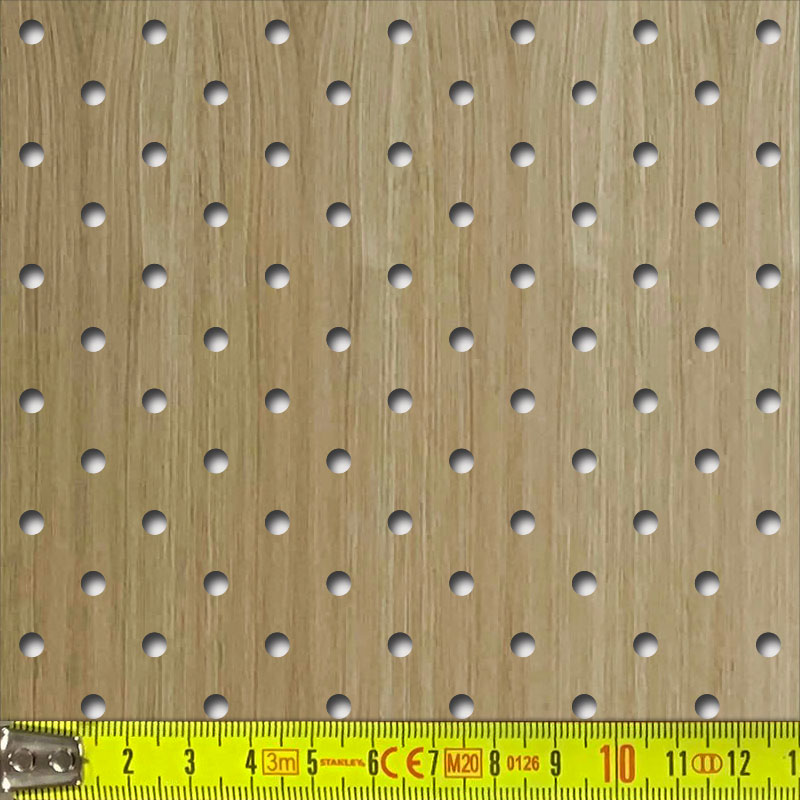 Perforált keményfarost lemez (HDF), mindkét oldalán felületkezelés nélküli valódi fafurnér.
